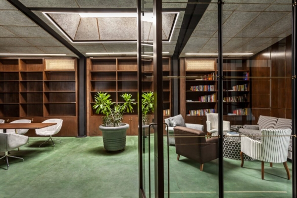 El salón público en Nueva Delhi, India, transforma el almacén en una biblioteca, auditorio y café que incluye acero, exteriores de vidrio e interiores nostálgicos.
