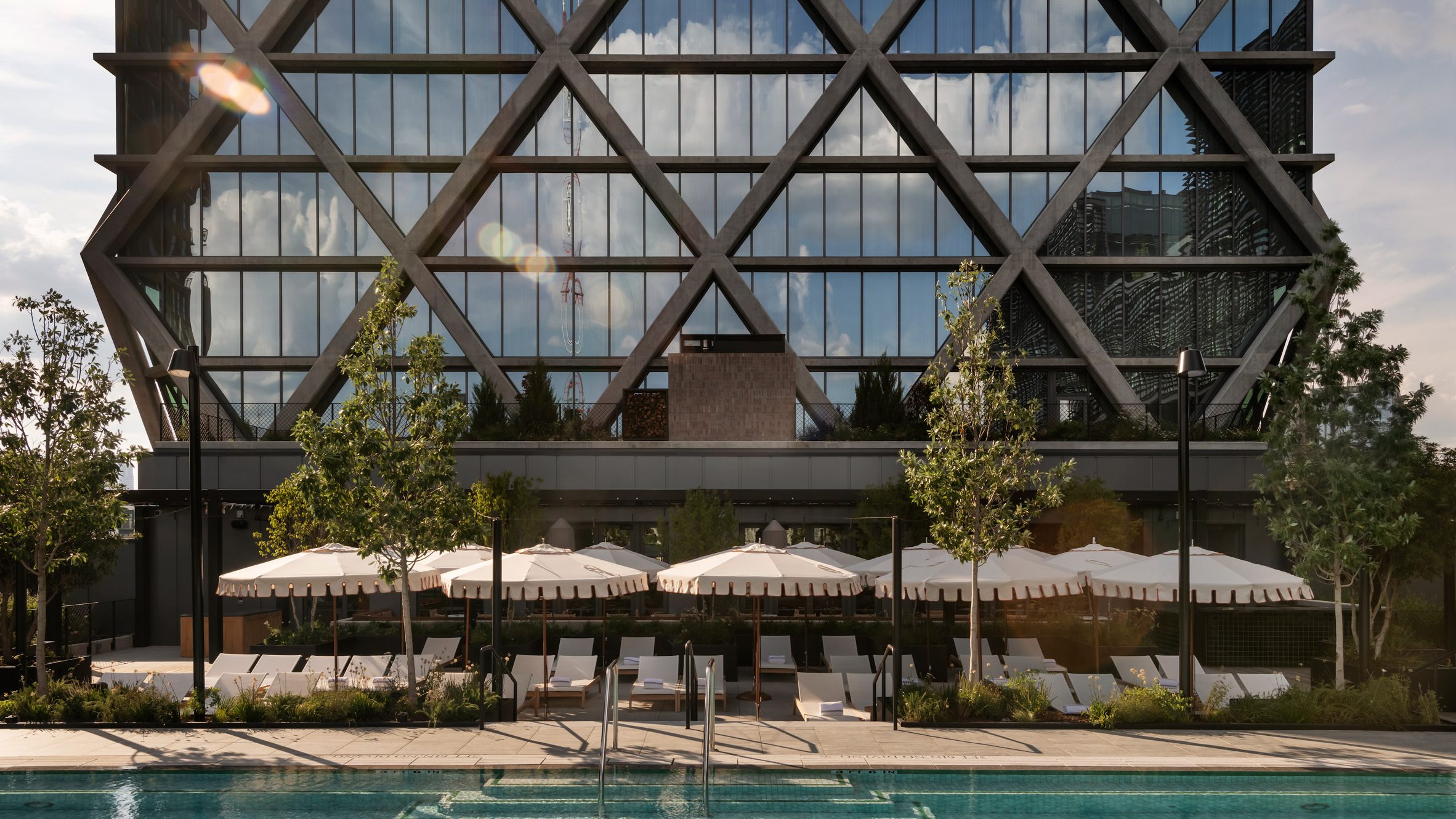 El podio también se extiende para formar una terraza de 2300 pies cuadrados (214 metros cuadrados) con una piscina al aire libre hacia el sur y una terraza más pequeña para clubes de miembros en el norte.