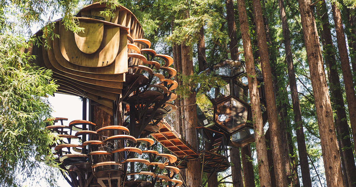La casa del árbol de ondas de secoyas se elevó a 35 pies en el dosel del bosque e imitó la forma orgánica de hongos.