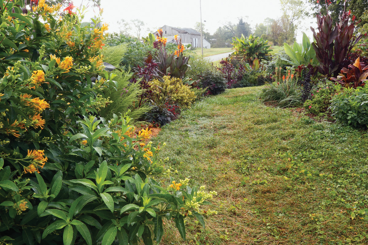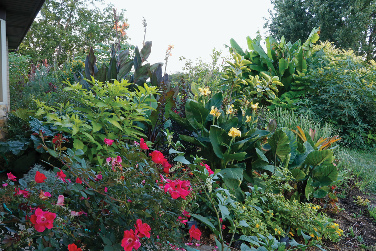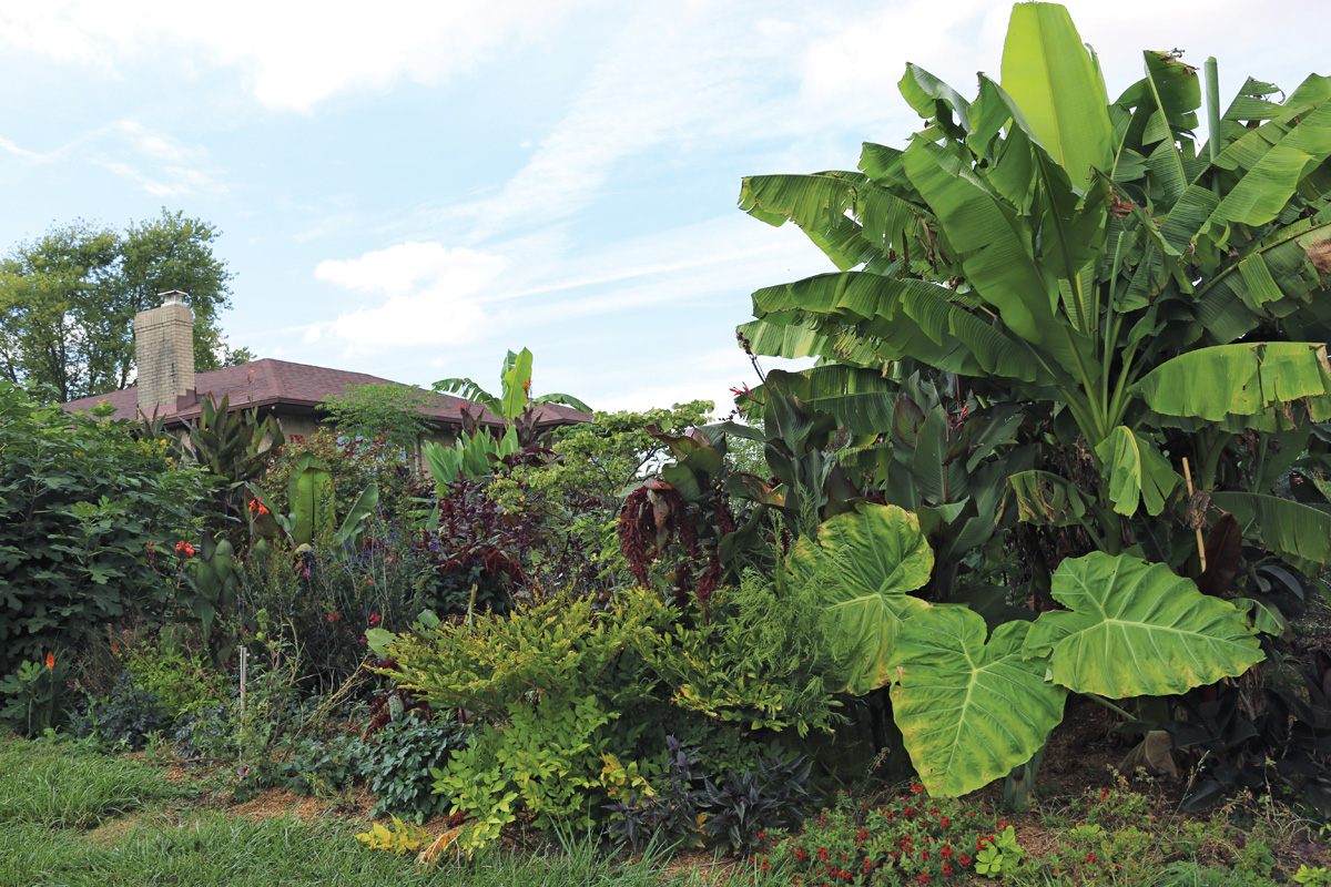 No tengo camas dedicadas a cada año y plantas tropicales. Casi todos los espacios tienen una mezcla de árboles, arbustos, plantas perennes y bombillas y están cubiertas con especies tropicales que me gustan. Las plantas tiernas representan del 25 al 40% del jardín y generalmente tienden a ser porcentajes mayores. A medida que las perennes y las plantas leñosas crecen y se acumulan en la cama, pierdo algo de espacio para las plantas tiernas.
