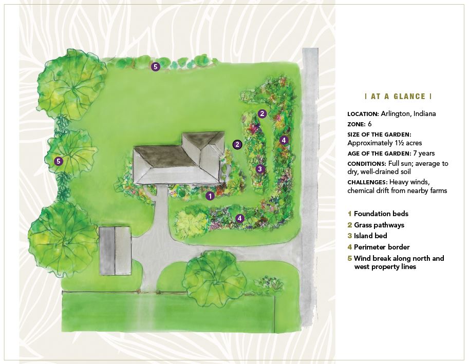 Compré mi casa en agosto de 2018 y regresé al país después de décadas de jardinería de pequeñas ciudades. Rodeado de tierras de cultivo abiertas, la nueva propiedad me ofrece la oportunidad de tener un jardín más grande, pero enfrenta algunos desafíos importantes. El viento aquí es feroz, especialmente en invierno, por lo que construir un árbol a lo largo de las fronteras del norte y occidental es una prioridad. Las propiedades adyacentes son granjas activas, por lo que las derivaciones químicas agrícolas ocasionalmente llaman la atención.