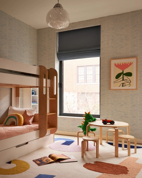 El fondo tranquilo de los bosques pálidos, el yeso blanco y los textiles neutros crean un ambiente interesante al tiempo que permite que la luz natural domine.