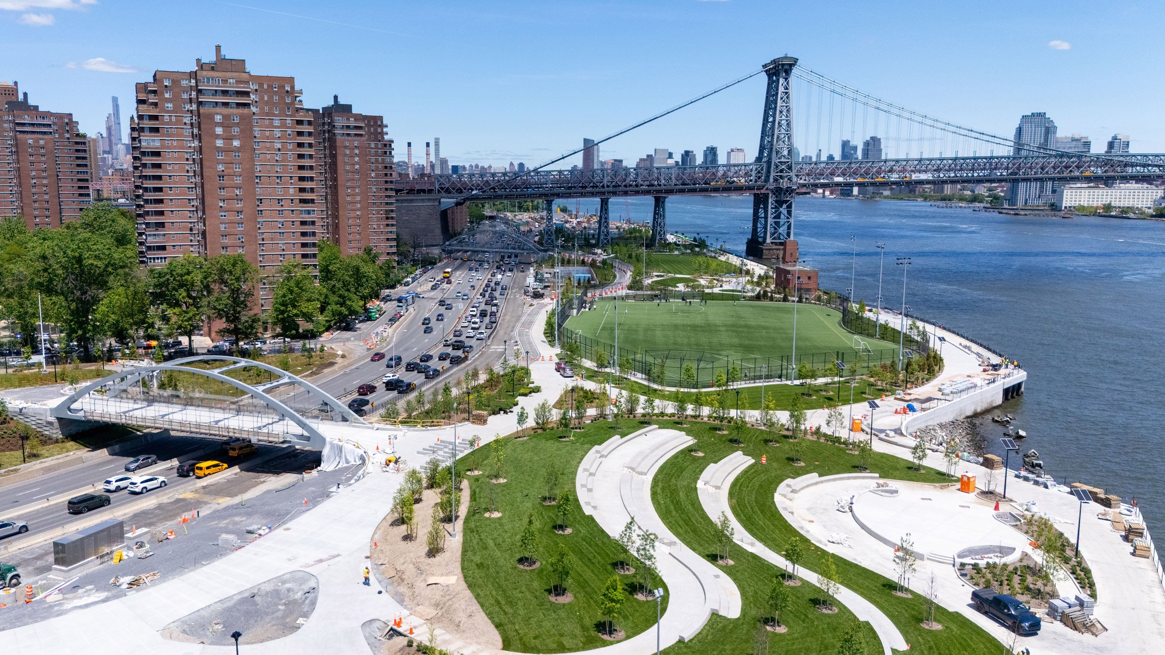 En el noreste, la reconstrucción del proyecto de competencia está diseñada para otra parte importante de la reconstrucción – Grande Diseñado por el estudio danés Big (en la foto de arriba) – estará abierto pronto. Ubicada en East River Park en la ciudad de Nueva York, esta sección abrió recientemente canchas de tenis, salpicaduras, fútbol y canchas de baloncesto.