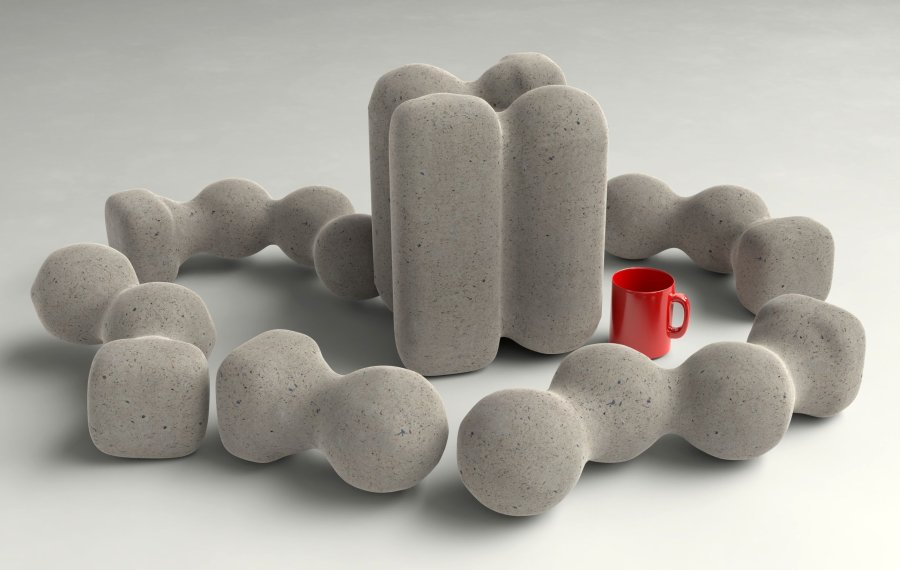 Todavía estoy en la etapa de diseño y no tengo trabajo físico a lo lejos. De todos modos, aquí está la eficiencia de la imagen en Rhino 3D, que es el software que utilizo para diseñar y renderizar 3D. Habrá un fragmento de mancuernas orgánico básico y suelto que se pueden reorganizar para crear diferentes configuraciones, al igual que el juego. Para que sea fácil de manejar, será más pequeño de lo que he hecho recientemente. La altura total es de aproximadamente 750 mm. Incluí una copa como referencia de escala en algunas representaciones.
