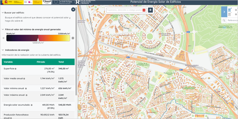 Del mismo modo, se incluyen nuevas capas para visualizar la radiación solar promedio de los edificios públicos y la radiación solar global en todo el terreno y en el suelo, lo que puede ser útil para crear huertos solares y otras novedades. Los usuarios pueden introducir una dirección postal y hacer clic en el edificio y mostrarán la capacidad de PV, así como el costo de instalación.