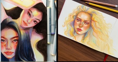 Un grupo Bloc de dibujo Retratos creados con diferentes medios: tinta/marcadores acrílicos y lápices.