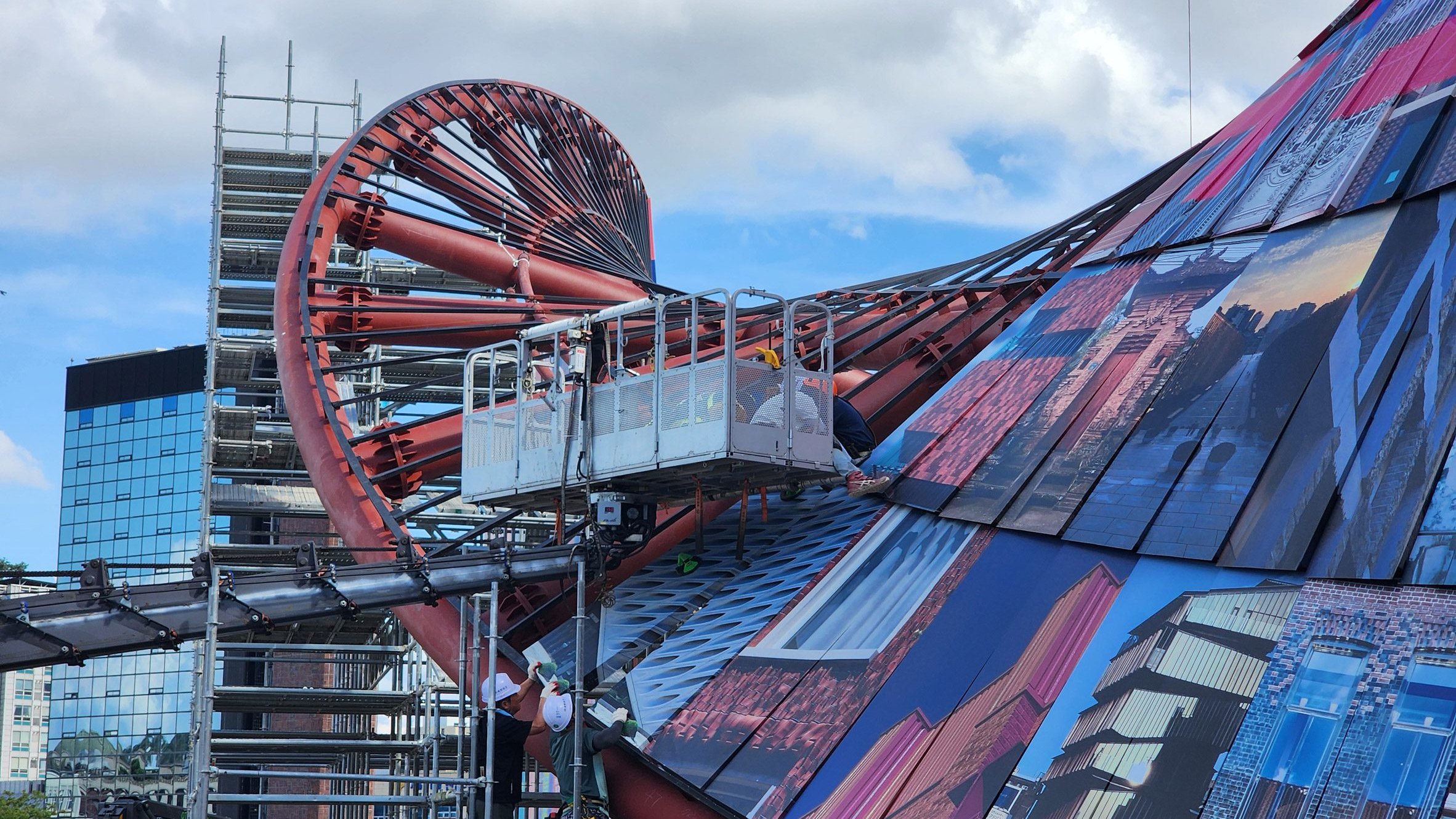 Recientemente, estas imágenes muestran una estructura de acero rojo corta y gruesa en una espiral espiral en la abertura central, al lado de la estructura secundaria de acero negro de al lado.