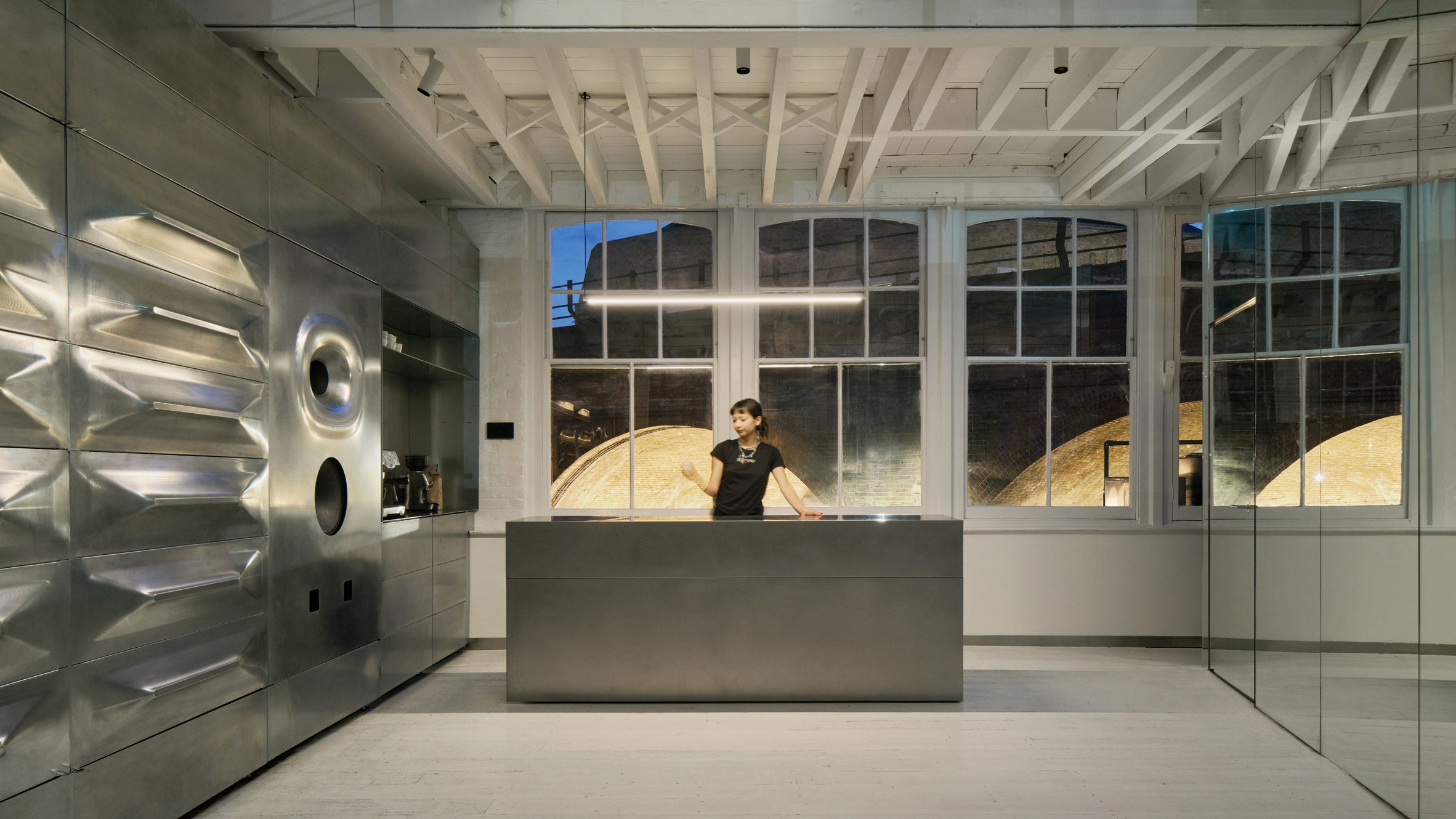 Con sede en Londres Obras desconocidas Diseñó una pared de sonido que se redisenga Acero galvanizado Y se agregan muebles de metal y accesorios para crear un salón de sal, que es un audaz y refinado salón“En el mercado del condado.