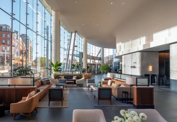 Un salón de cabildeo de nivel 3 del Congreso abarca toda la ciudad. Su apariencia tiene vidrio curvo complejo y está soportado por estructural con cubierta de acero para lograr su forma elegante.
