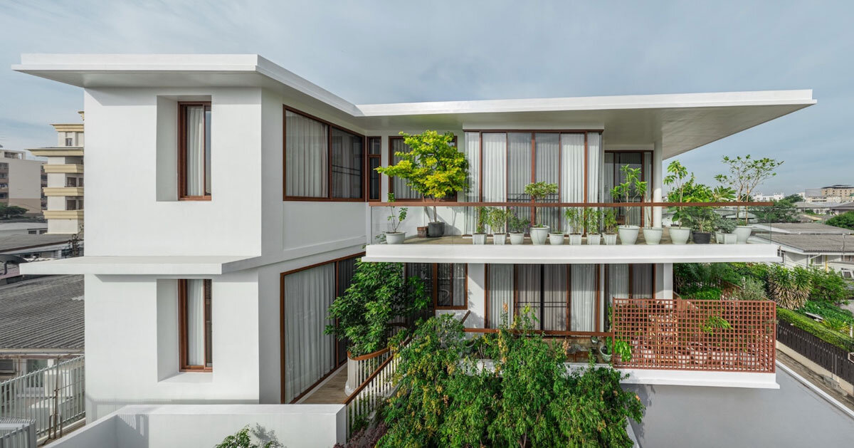 Estos balcones tienen un doble propósito: proporcionan espacios de jardinería a pequeña escala en entornos urbanos densos, funcionando como dispositivos de sombra pasiva para proteger el interior de la luz solar y el agua de lluvia del clima tropical de Bangkok. Otras características que responden al clima incluyen voladizos de techo ancho y aluminio La pantalla de red mejora la ventilación, regula la luz del día y garantiza la privacidad.