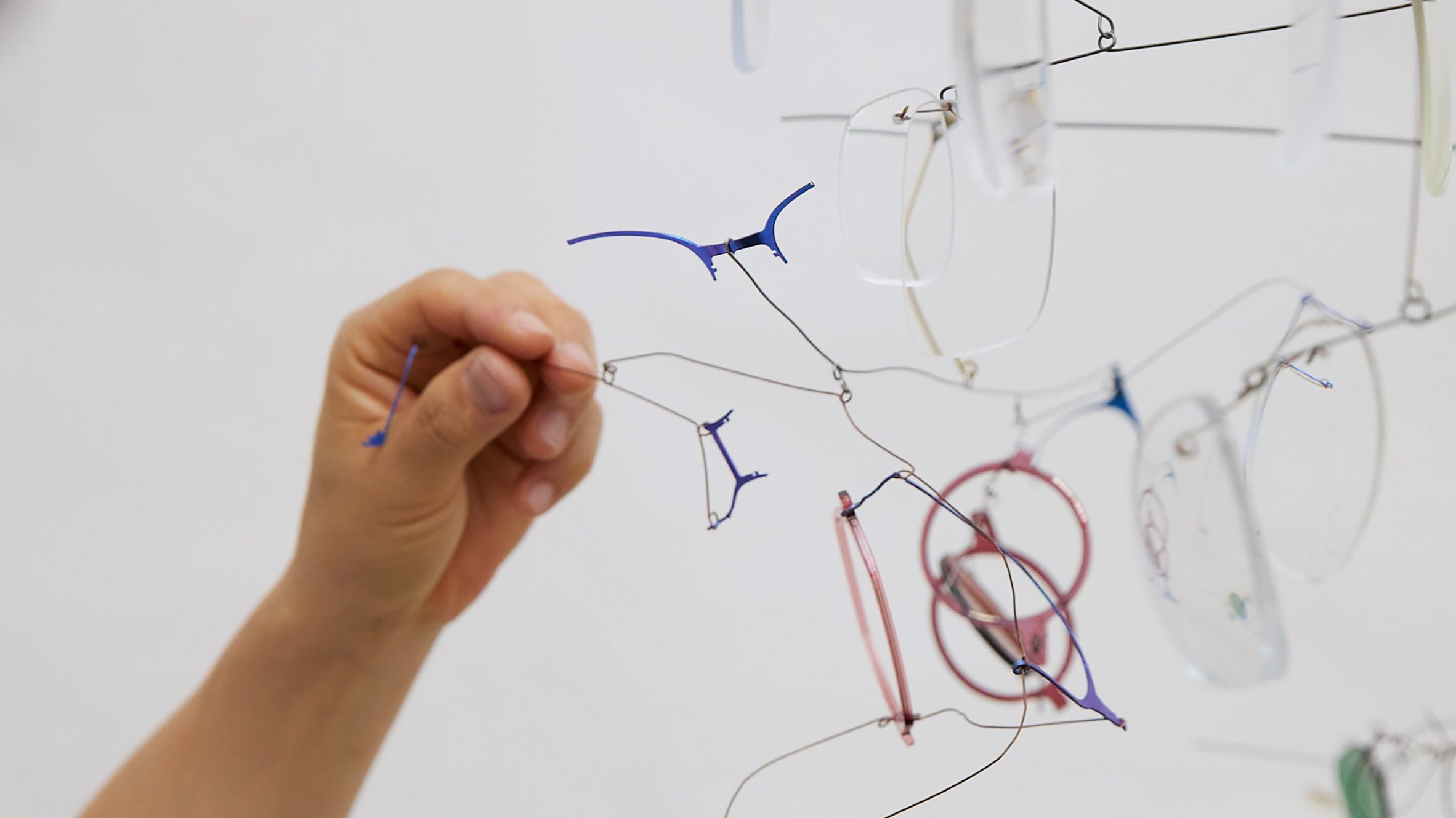 Cada teléfono está diseñado para explorar la relación entre la luz, el color y el peso. La escultura etérea está colgada por delicados cables, que es el guiño de las icónicas gafas con marco de titanio de la marca.