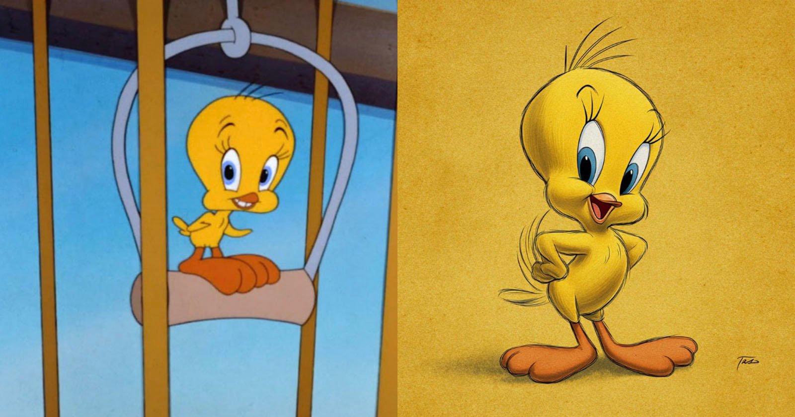 Imagen de lado a lado del pájaro chirrido; A la izquierda, la versión clásica de dibujos animados está en una jaula de pájaros y a la derecha hay una ilustración moderna y exhaustiva que se encuentra con confianza sobre un fondo amarillo.