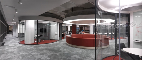 En el primer piso, Crimson, el equipo de ventas y desarrollo de negocios de la compañía de entrega de alimentos en línea y plataformas de negocios rápidos y en una estación de trabajo abierta y una suave cabina de la conferencia de cápsula de vidrio curvado.