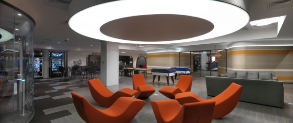 El área de asientos circulares inferiores proporciona un espacio de descanso informal y atractivo para la oficina abierta.