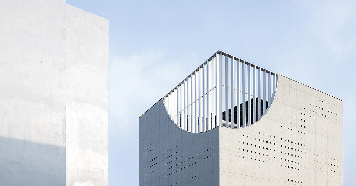 El movimiento celestial del sol desde el amanecer hasta el atardecer, el patrón curvo se hace eco del movimiento celestial del sol, mientras que las aberturas arqueadas en el suelo permiten el acceso a los jardines cuadrados y laterales. Estos gestos introducen permeabilidad y apertura, lo que contrasta con la solidez de la calidad concreta. Entre la cáscara pesada y el volumen de vidrio más ligero, hay un espacio de aurícula de transición donde el aire y la luz ciclo libremente, diseñando el cielo como el eje vertical de la dirección.
