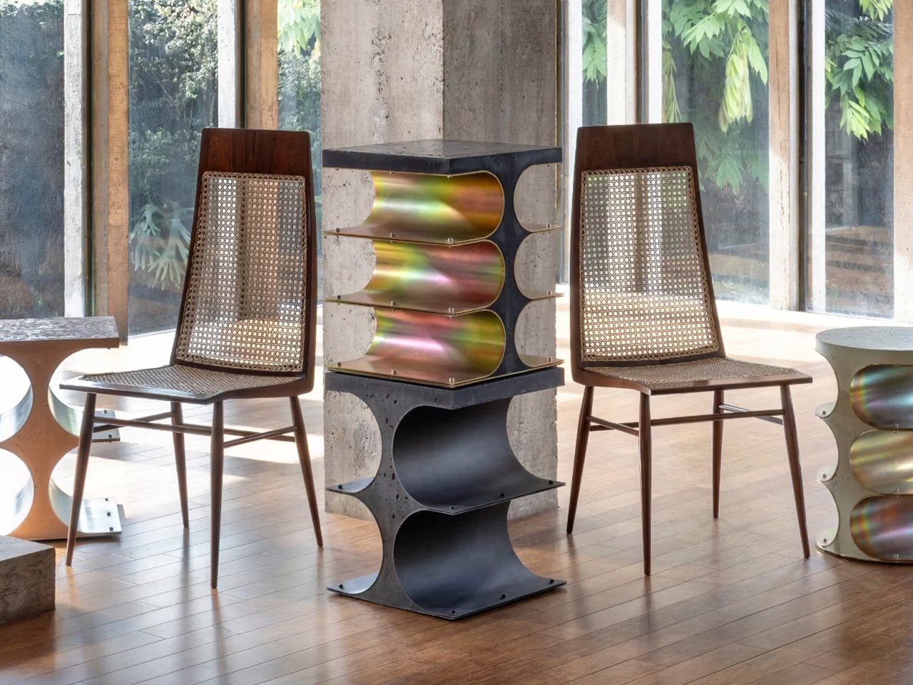 Sims no es tímido con su inspiración. Está guiando al maestro modernista brasileño Joaquim Tenreiro, quien casi inventó la estética del siglo del país ese día. Pero esta no es una mirada nostálgica hacia atrás. Simões tome las elegantes curvas y la precisión geométrica de Tenreiro, luego aumente el volumen hasta que obtenga muebles que parece que puede anclar una habitación o arreglar un edificio.
