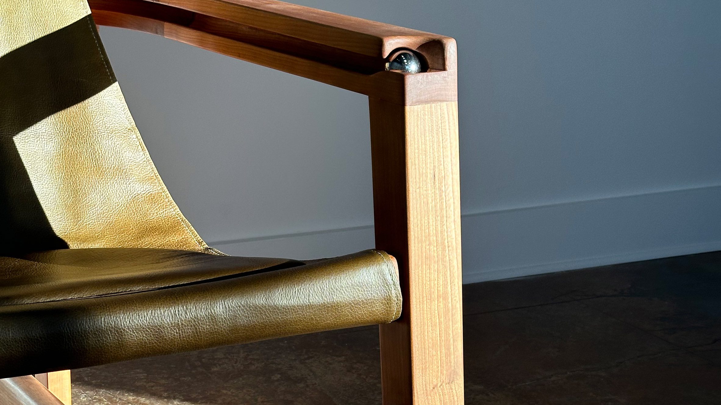 La silla reflectante está hecha de Madera de cereza,verde cuero Las hondas forman asientos. Heggard dijo que eligió materiales familiares que se mezclarían silenciosamente con la mayoría de los entornos.