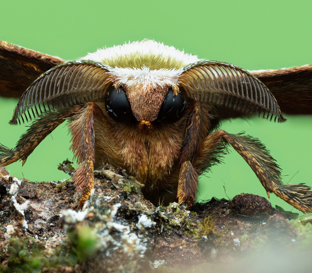 Primer plano de una polilla peluda con grandes antenas plumosas y ojos oscuros encaramados en una superficie de textura, apoyada contra un fondo verde brillante.