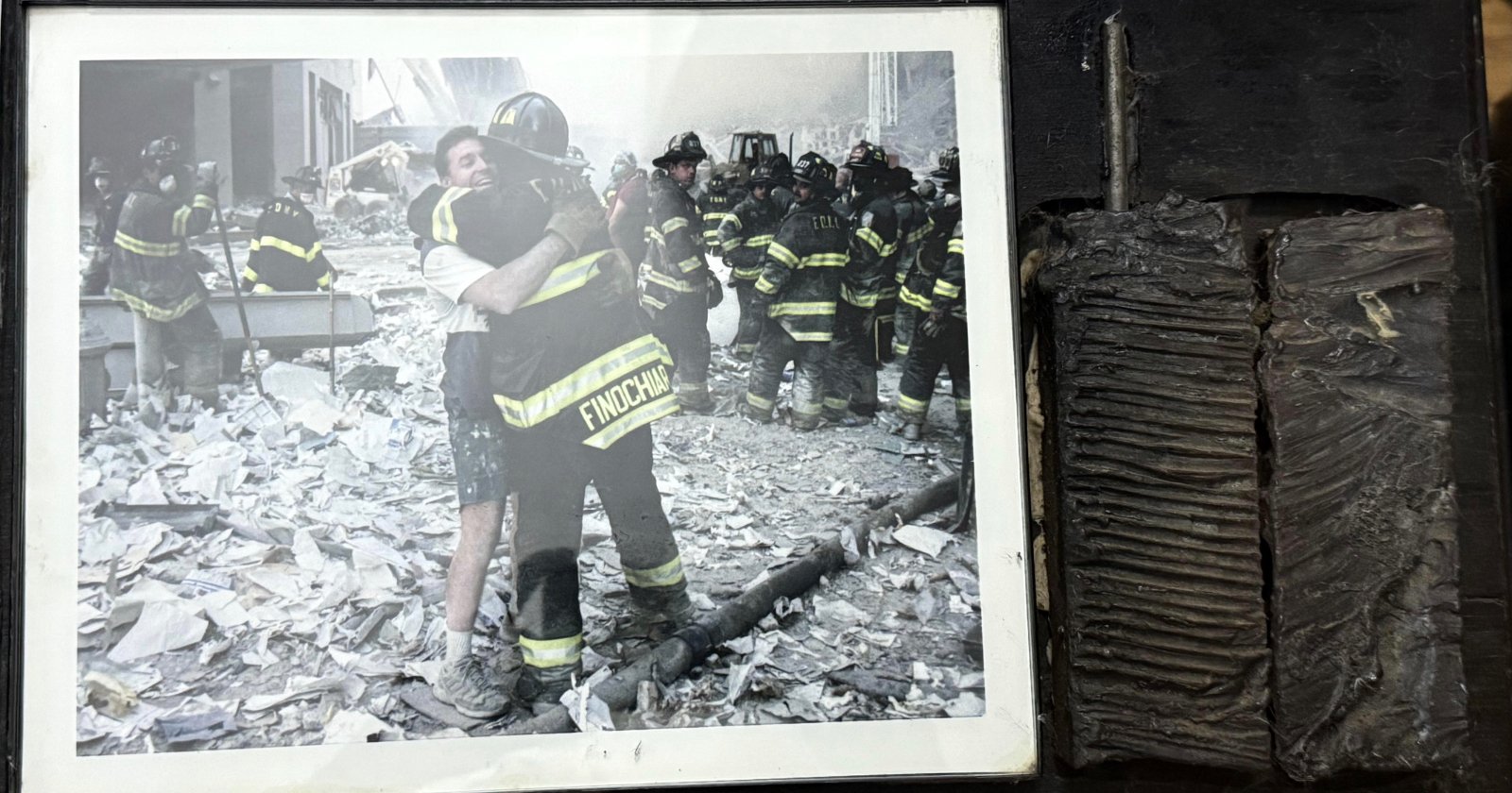 Una foto enmarcada muestra a dos hombres (uno en equipo de fuego) envueltos en escombros, mientras que varios bomberos se paran detrás de ellos. En el lado derecho de la foto hay un objeto de metal de costilla quemada.