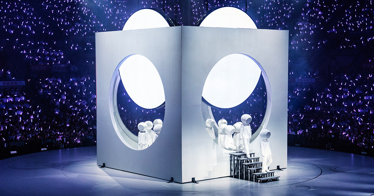 El cubo se considera la caja de Pandora, abierta y cerrada para revelar las capas de varias capas de la narrativa del programa. En un orden, se desarrolla en el piso del escenario en una forma más (+), un símbolo visual de unísono y conexión. En otros momentos, se puede realizar a través de una apertura circular, tocando cantantes en actuaciones de baile, mientras que la coreografía se reproduce internamente o se convierte en un barco proyectado, los efectos visuales (como la cara del reloj) despiertan los temas de la memoria y el tiempo. La pantalla LED circular que cuelga sobre el lado del lado opuesto del cubo, a veces similar a las gafas abstractas, plantea el rendimiento desde una nueva perspectiva.