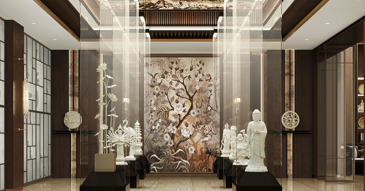En el interior, el diseño se origina en la tradición arquitectónica china, al tiempo que adopta un enfoque moderno para el minimalismo. Los aleros y las paredes de pantalla reinterpretados crean cualidades espaciales en capas, con marrones oscuros, grises y meggs mejorando una atmósfera tranquila y sofisticada. Las principales salas de exhibición incorporan escaleras flotantes y reinventan la inspiración de la arquitectura del jardín chino. Esta integración de elementos interiores y exteriores crea apertura mientras mantiene la resonancia cultural.