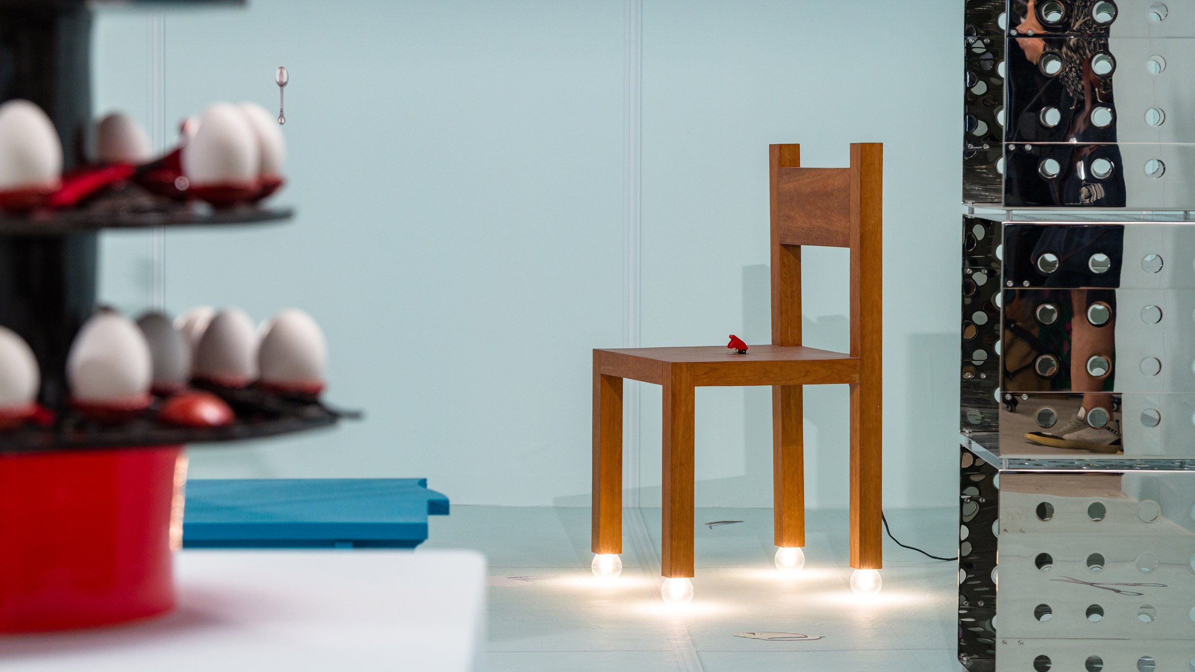 Ejemplos de curado incluyen las llamativas sillas de los diseñadores estadounidenses Jisu Han Jung Pies con bombillas que lo hacen más ligero que las sillas, y el surrealista de huevos de cerámica en Nueva York fefostudio.