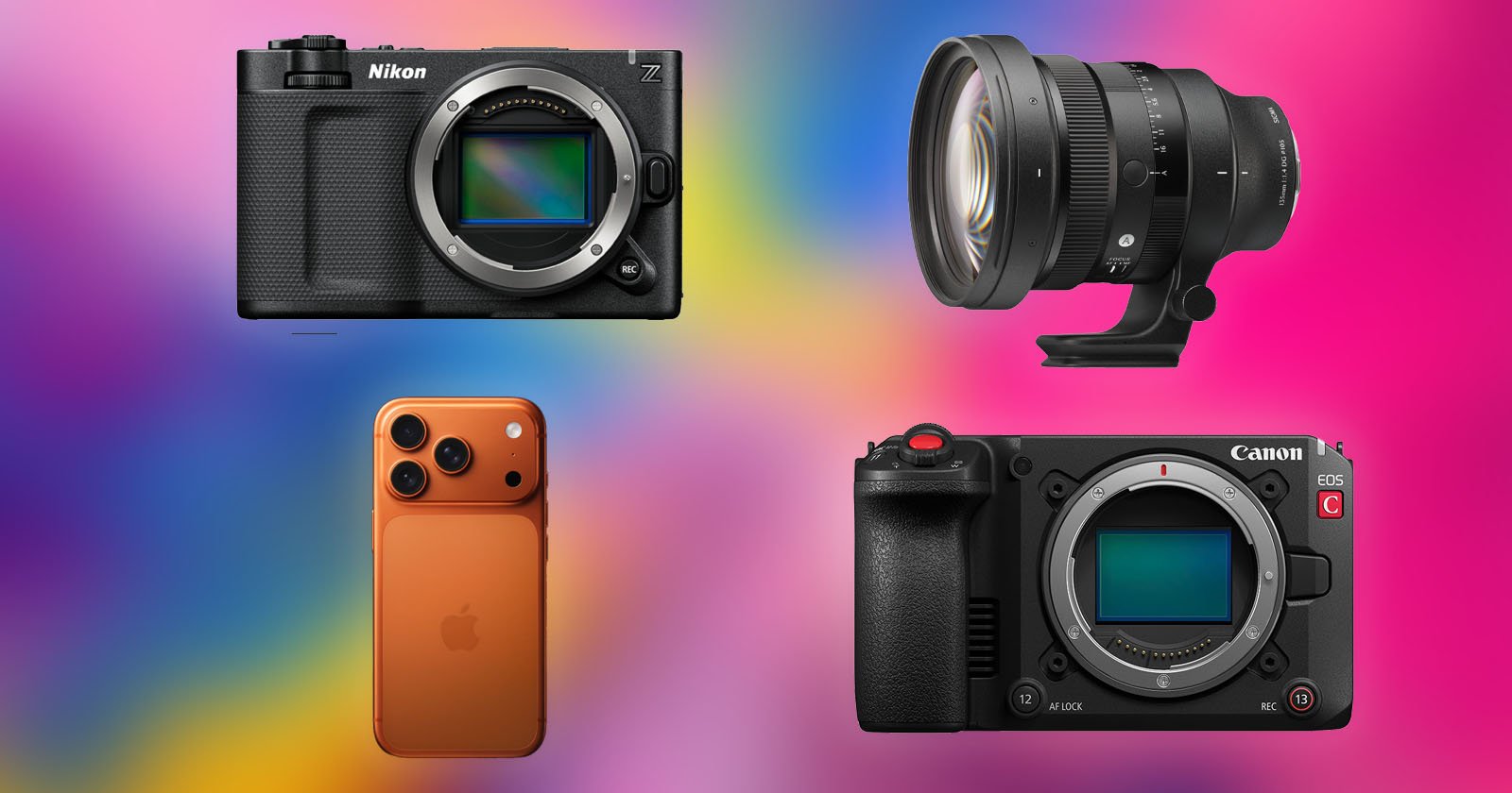 Cuatro dispositivos dirigidos a fondos de gradiente de color: cámara sin espejo Nikon (arriba a la izquierda), lente de cámara grande (arriba a la derecha), iPhone naranja (abajo a la izquierda) y una cámara sin espejo Canon (abajo a la derecha).
