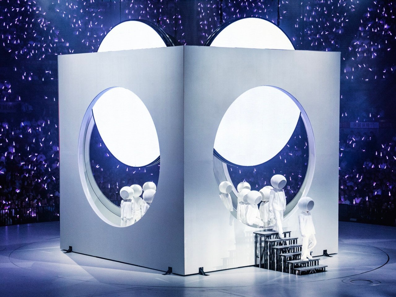 El estadio Hong Kong se convirtió en una arena dinámica de narración de historias el 10 de septiembre de 2025, cuando Ruby Law, fundador de Rula Design Studio, lanzó un cubo blanco de siete metros que se pliega, brilla y se deforma en el concierto de «Summer White Summer» de Terence Lam. El núcleo escultórico se encuentra debajo de dos pantallas LED circulares, creando un fuerte contraste entre el cuadrado rígido y los paneles de luz circular circundante, una metáfora visual para el tema dualista del espectáculo, donde las luces y las sombras, la alegría y la melancólica se entrelazan.
