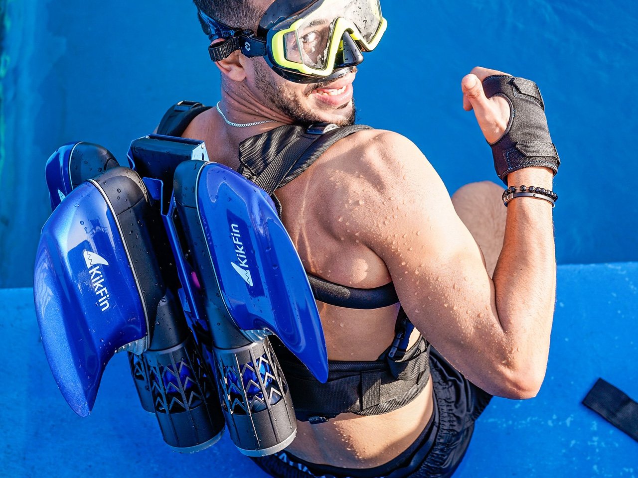 El Jetpack Kikfin Shark tiene dos aletas inductoras de cofre que ayudan al dispositivo a imitar los movimientos de criaturas marinas rápidas como los tiburones, por lo tanto, el nombre. Se usa detrás, dando al usuario libertad manos libres para moverse libremente en el agua como si fueran parte del ecosistema natural marino.