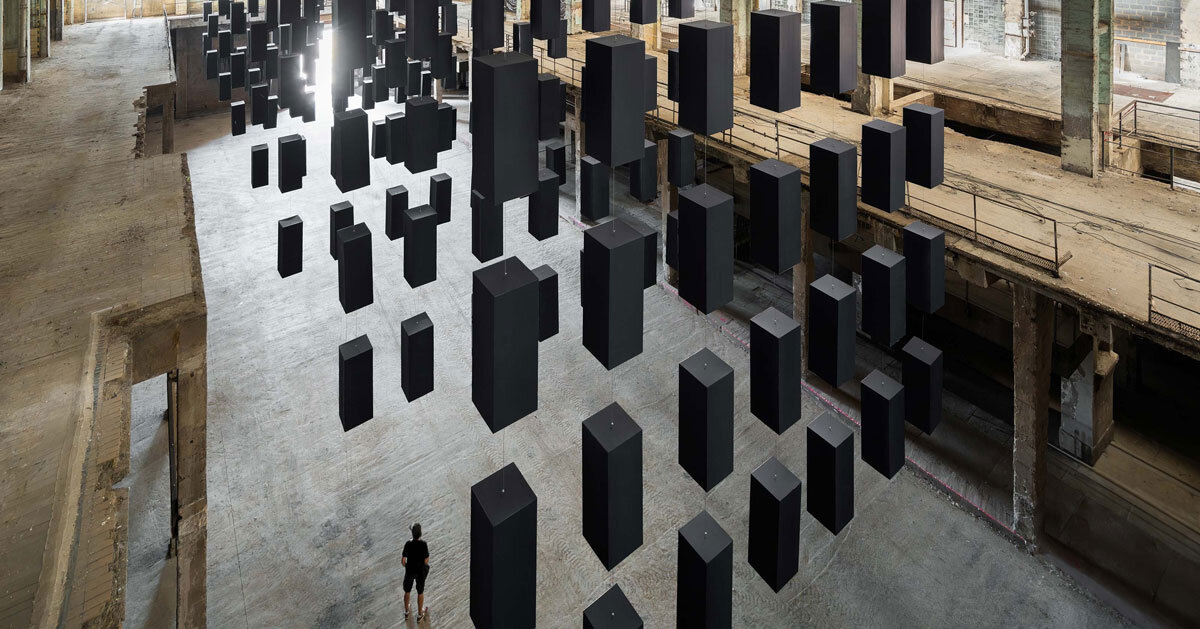 Dentro de la sala principal de la antigua fábrica de turbinas del artista español espiar Se ha introducido matriz, que es una gran escala Instalar Que consiste en una cuadrícula tridimensional de elementos rectangulares negros suspendidos.