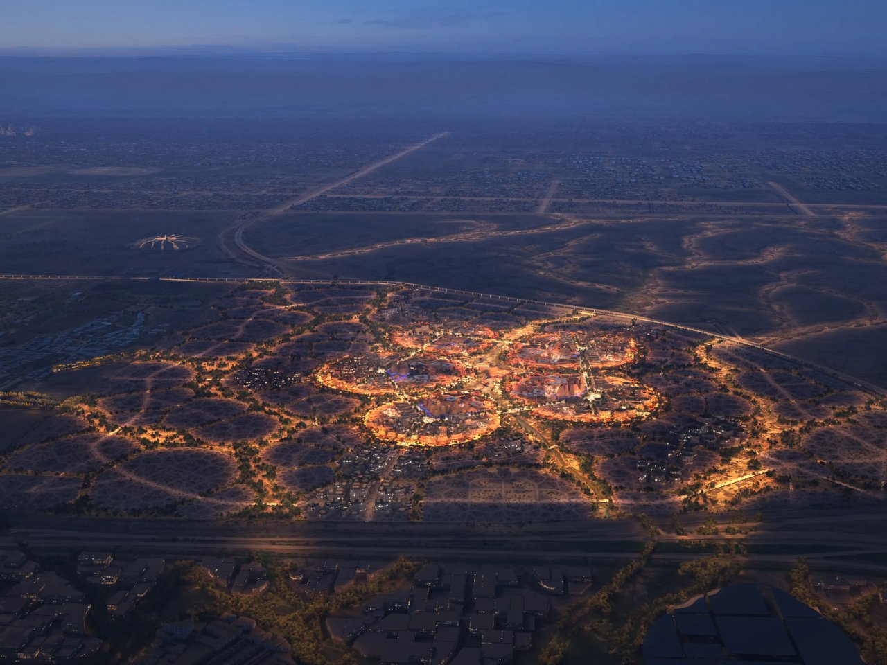 El sitio organiza alrededor de cinco regiones principales, irradiando a las cuadrados centrales, como los pétalos, cada uno dedicado a temas específicos: tecnología de cambio, soluciones sostenibles, personas prósperas, Arabia Saudita y colaboración global. Cada región es una aldea única con su propia conveniencia y lenguaje arquitectónico basado en la geometría fractal, y a lo largo del proceso de desarrollo, los patrones se repiten en diferentes escalas para repetir sin monotonía.