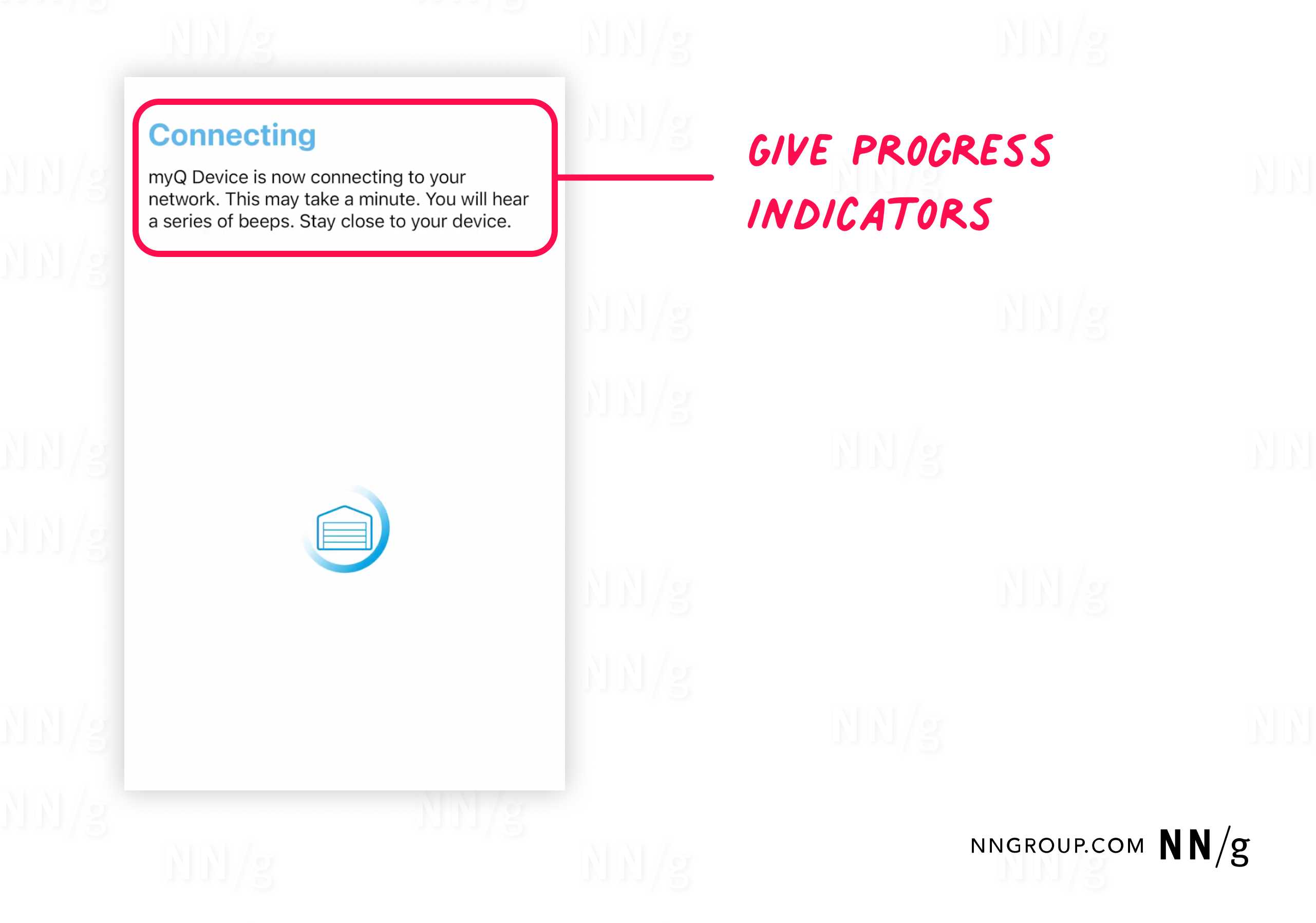 Si el dispositivo se está conectando, acérquese. Proporcionar orientación similar Manténgase cerca de su dispositivo E, idealmente, incluye una estimación de cuánto tiempo lleva el proceso. Esto evita que el usuario se sienta confundido o frustrado y mejora el sentido de control.