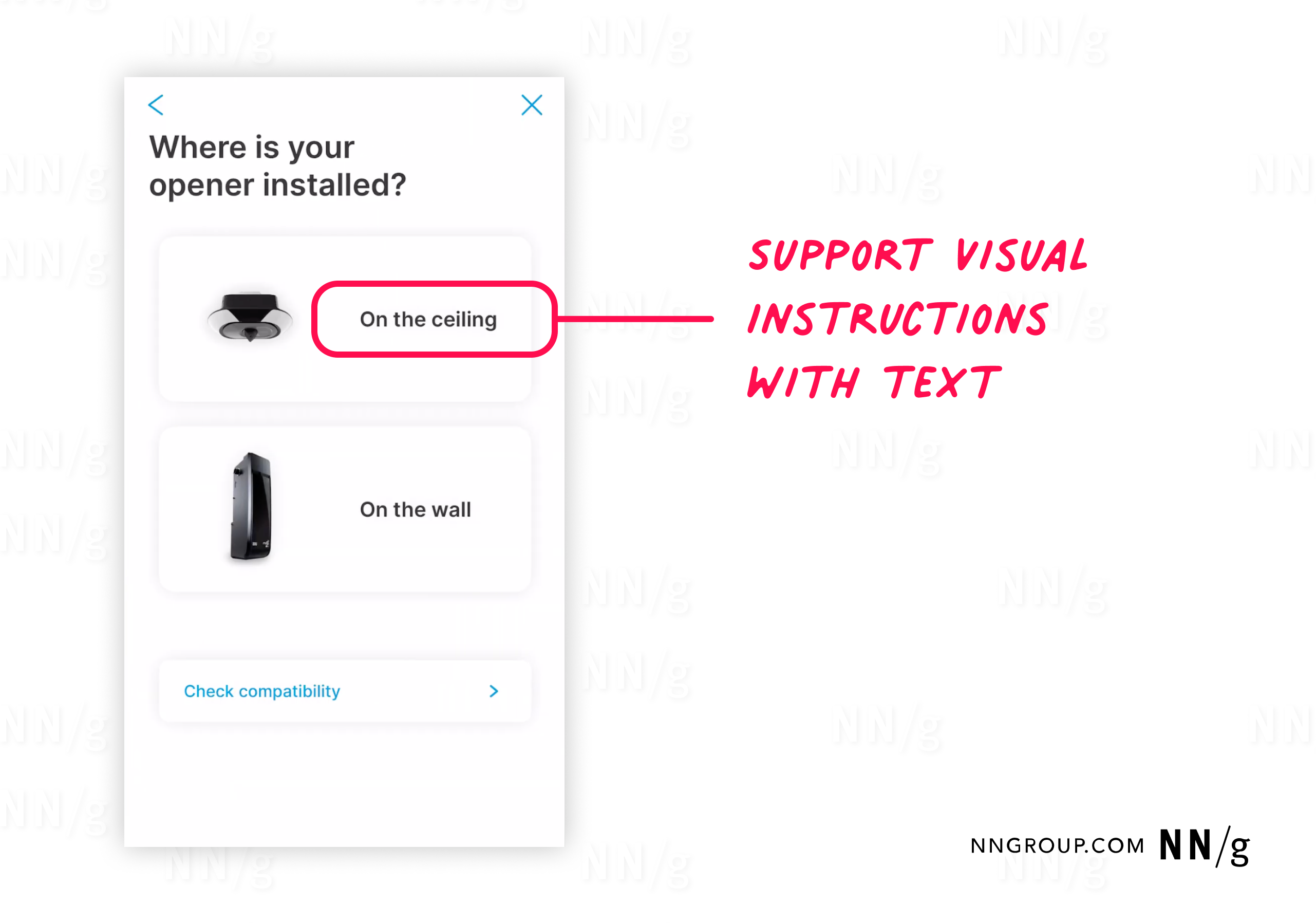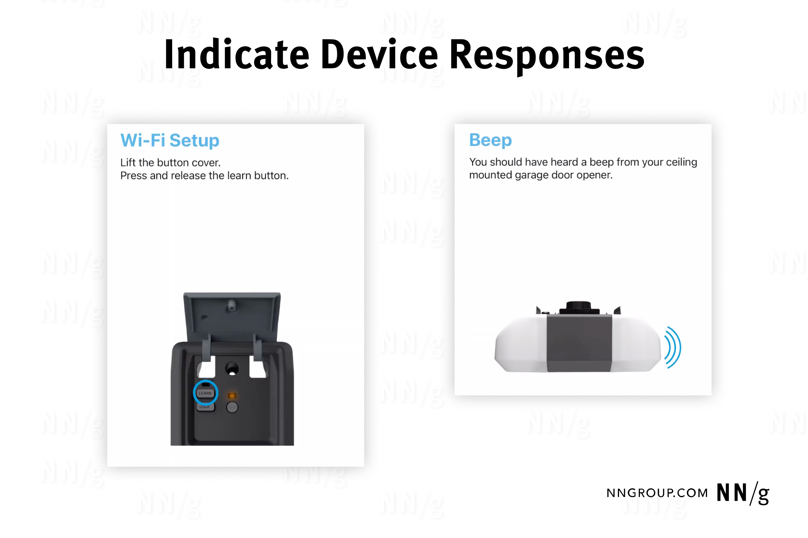 - Consejos de retroalimentación del equipo. Dígale a los usuarios qué esperar del dispositivo, como luces intermitentes o pitidos, para que puedan confirmar el progreso con confianza.