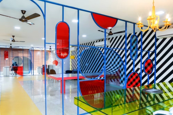 Los colores audaces y los extravagantes acentos de muebles de oficina en la partición enfatizan la identidad de un equipo creativo dinámico.