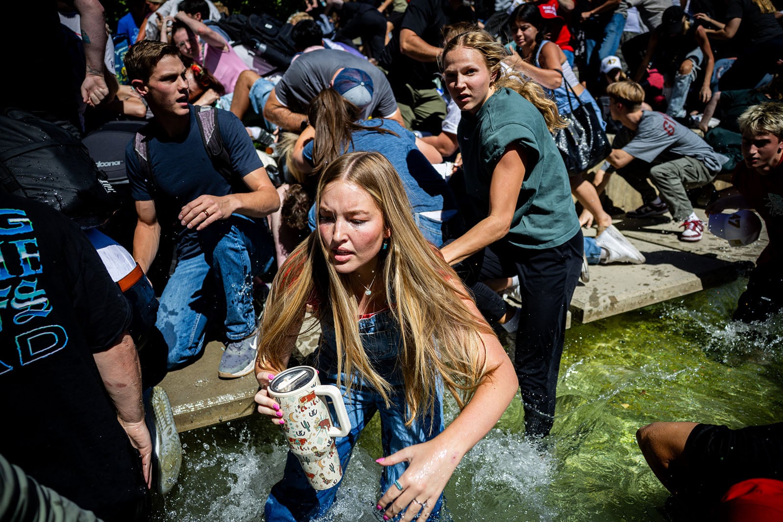 Un joven fotógrafo de noticias se mantiene fresco después de que Charlie Kirk es asesinado a tiros