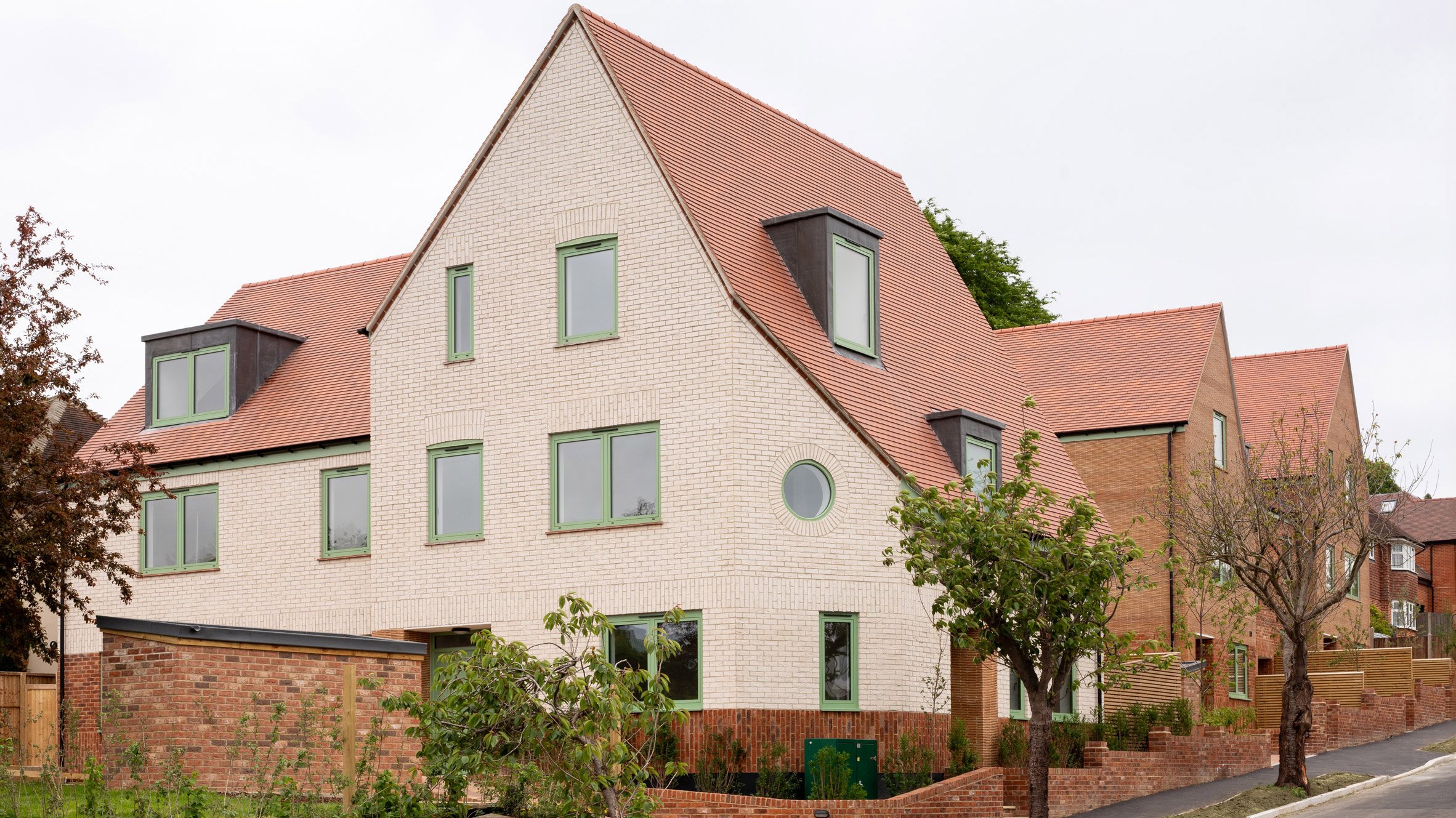 Architectural Studio Harp y Harp han completado el Proyecto de Desarrollo Residencial Londres pálido ladrillolas baldosas de techo rojo y los marcos de ventanas verdes claros cuentan con sus vecinos de estilo artístico y artesanal.