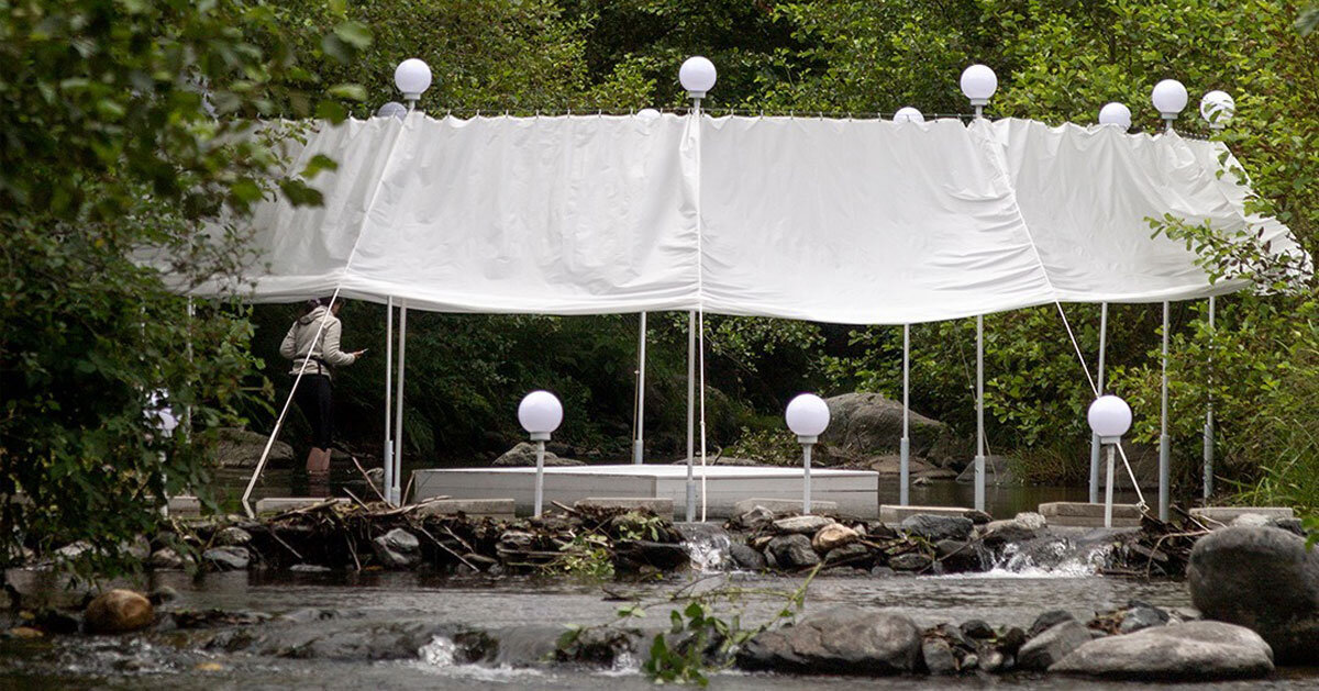 La instalación temporal de Atelier Vrac en el río Mountain se propuso durante el festival Făgăraș en el río Moașa Sebeșului, un afluente del río Făgărainainssebeș en Rumania. este Instalar Consiste en estructuras circulares precisas directamente dentro del lecho del río, construyendo el entorno natural a través de la intervención arquitectónica al tiempo que permite que el agua fluya libremente por debajo. El círculo crea un límite geométrico para formar una «habitación» al aire libre » Temporalmente Redefine el paisaje lineal del río. El límite consiste en elementos verticales alargados arriba El sol Tierra ligera, acompañada de suspensión textil El dosel produce una carcasa permeable a la luz. El dosel cepilla suavemente la vegetación en ambos lados del estrecho, integrando hábilmente el entorno circundante en la instalación.