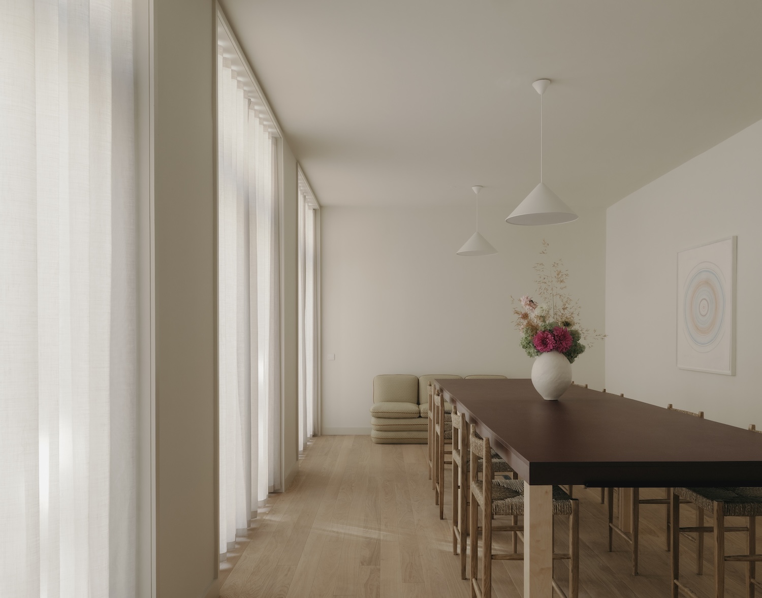 La paleta interna muestra las mismas limitaciones e inteligencia. El roble resistente pisa cada apartamento táctil táctil, mientras que los pisos de madera de algodón blanquecino proporcionan elegantemente un acabado limpio y duradero. Los bancos de trabajo de Terrazzo en la cocina proporcionan una elasticidad práctica y texturas visuales sutiles, con su composición general haciéndose eco del carácter ensamblado del proyecto. En el baño, los grifos y cuencas de estilo eduardiano reconocen los orígenes de la mente del edificio sin calcomanías, mientras que las costillas sobre las baldosas de vidrio y los detalles tradicionales de borde negro despiertan el interés visual a través de las sombras y los reflejos en lugar de la decoración de la superficie.