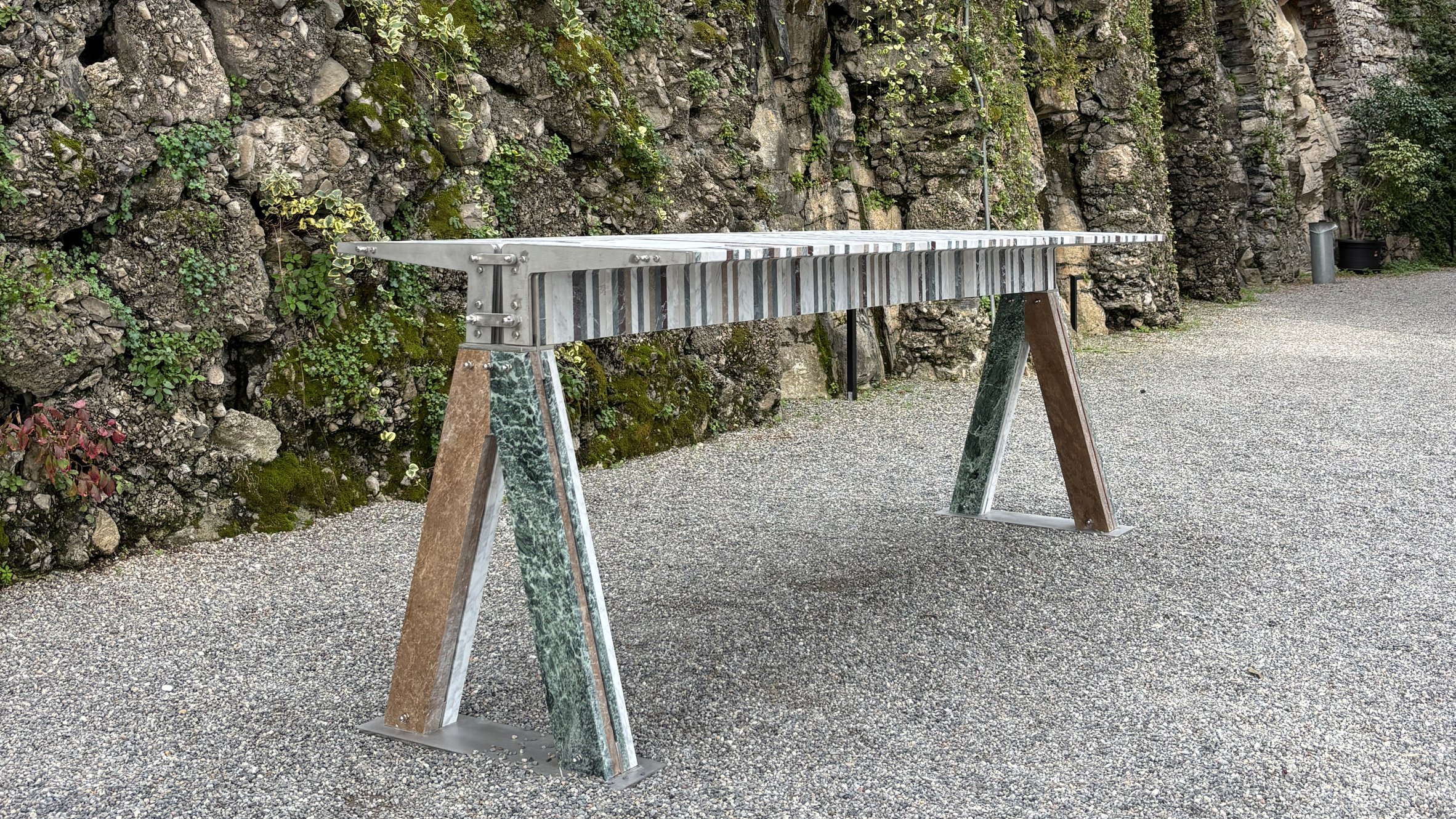 Mesa hecha de soportes de acero inoxidable en fragmentos de mármol y áreas de grava al aire libre