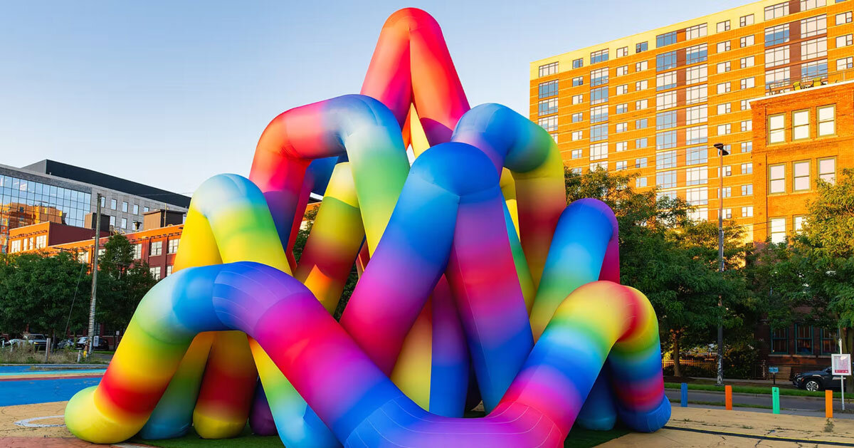 En el River Festival regresando a Grand Rapids, Cyril Lancelin – Ciudades y concreto Introducción a su último masivo Inflable InstalarPiramid Bord. La vibrante estructura inmersiva transforma el paisaje urbano en un patio de recreo de color y geometría, invitando a los visitantes al laberinto tridimensional del arco iris.
