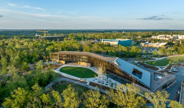 Diseñado por la compañía local Marlon Blackwell Architects, el edificio presenta aletas de latón desgastadas que envuelven el exterior, filtra la luz del día al regular la exposición solar.