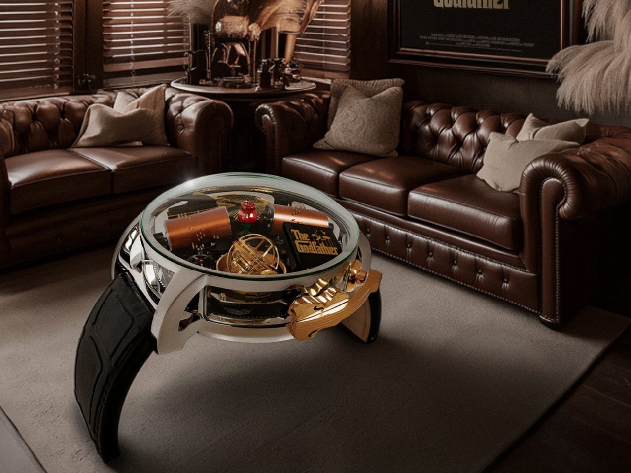 Desde la primera aparición de la lujosa mesa es su gran forma de abuelo de ópera, su apariencia no solo es similar. La mesa central presenta un movimiento mecánico y una caja de música icónica, al igual que en los wearables, toca el tema del padrino. La creación colaborativa empuja los límites entre el arte y los muebles al mismo tiempo, convirtiendo el reloj icónico en una obra de arte funcional extraordinaria.