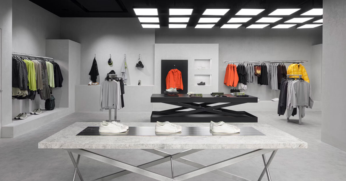 este Equipo de diseño En un estudio de grabación aleatorio, el espacio entre los dos conjuntos principales se distingue por una paleta de material. La serie Urban está equipada con accesorios articulados que contienen vidrio, piedra natural y acero inoxidable. En contraste, la serie deportiva consiste en elementos de acero negro, caucho y estilo industrial. Un área social dedicada ofrece a los visitantes asientos en dos áreas elevadas. Este espacio es brillante y limitado en la expresión y juega un punto de pausa en un entorno minorista más grande.