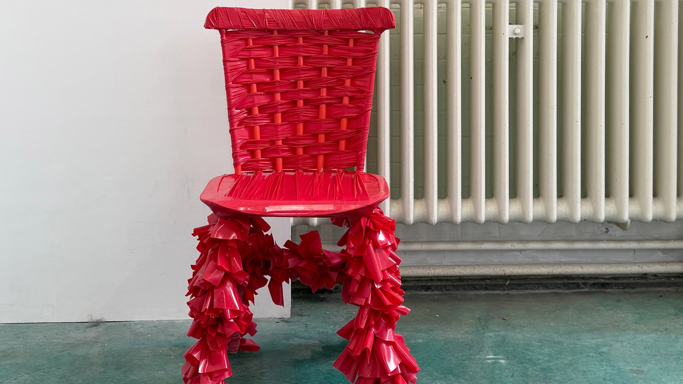 2lg Studio La silla cansada fue restaurada con una banda de resistencia roja brillante, que se entrelazó en el respaldo y formó pliegues dramáticos en las piernas.