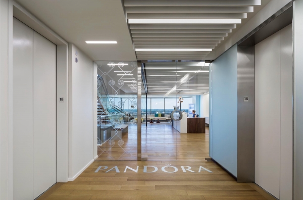 La recepción y el área de visitantes contienen vidrio de Murano y materiales de alta gama para mejorar la identidad de Pandora y convertirse en una marca de estilo de vida con productos de lujo asequibles.