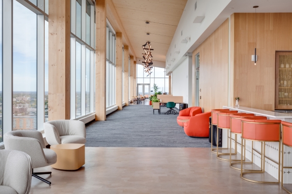 Sobre la base de concreto del edificio, se construyeron 19 pisos a partir de marcos de madera a gran escala expuestos. La terraza en la azotea ofrece extensas vistas panorámicas del centro de Milwaukee y Lake Michigan.