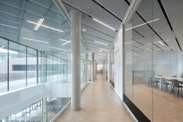 Los corredores y galerías cubiertos de vidrio permiten vistas y luz solar ambiental del espacio de estudio.
