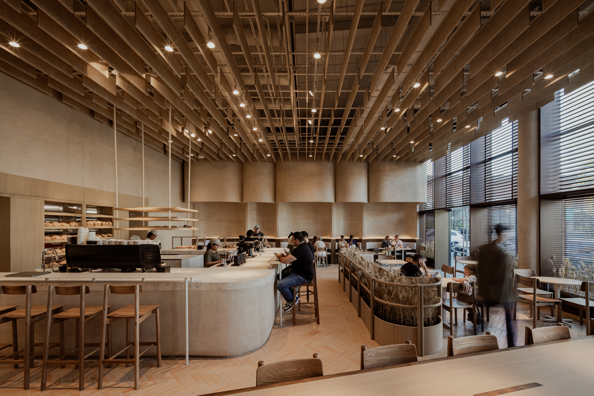 Mallol Arquitectos utiliza madera de origen local para dar forma a la atmósfera de esta panadería de la ciudad de Panamá. La madera forma estantes, mostradores y muebles personalizados, agregando calidez a las paredes de tierra compactadas. Juntos, los materiales se arraigan en el interior de su entorno y reducen la huella de carbono del edificio. Al comprar madera localmente, el proyecto reduce las emisiones de transporte y admite procesos regionales.