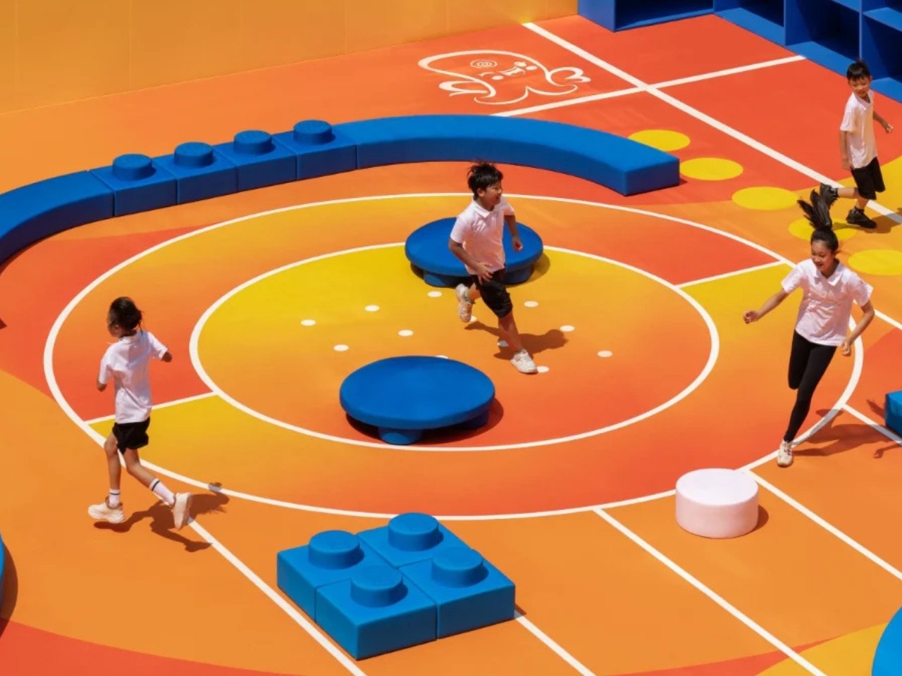 El lenguaje visual del patio de recreo está indudablemente inspirado en LEGO: colores primarios audaces, formas y patrones entrelazados que imitan los sementales exclusivos del ladrillo. Estos elementos guían a los niños a escalar, tejer y saltar, alentando deportes estructurados y canchas libres. El diseño también combina el espíritu de actuación de Nike, junto con la superficie que soporta sprints, entrenamiento de agilidad y equilibra los desafíos, convirtiendo una breve pausa entre las lecciones en un pequeño campo de entrenamiento.