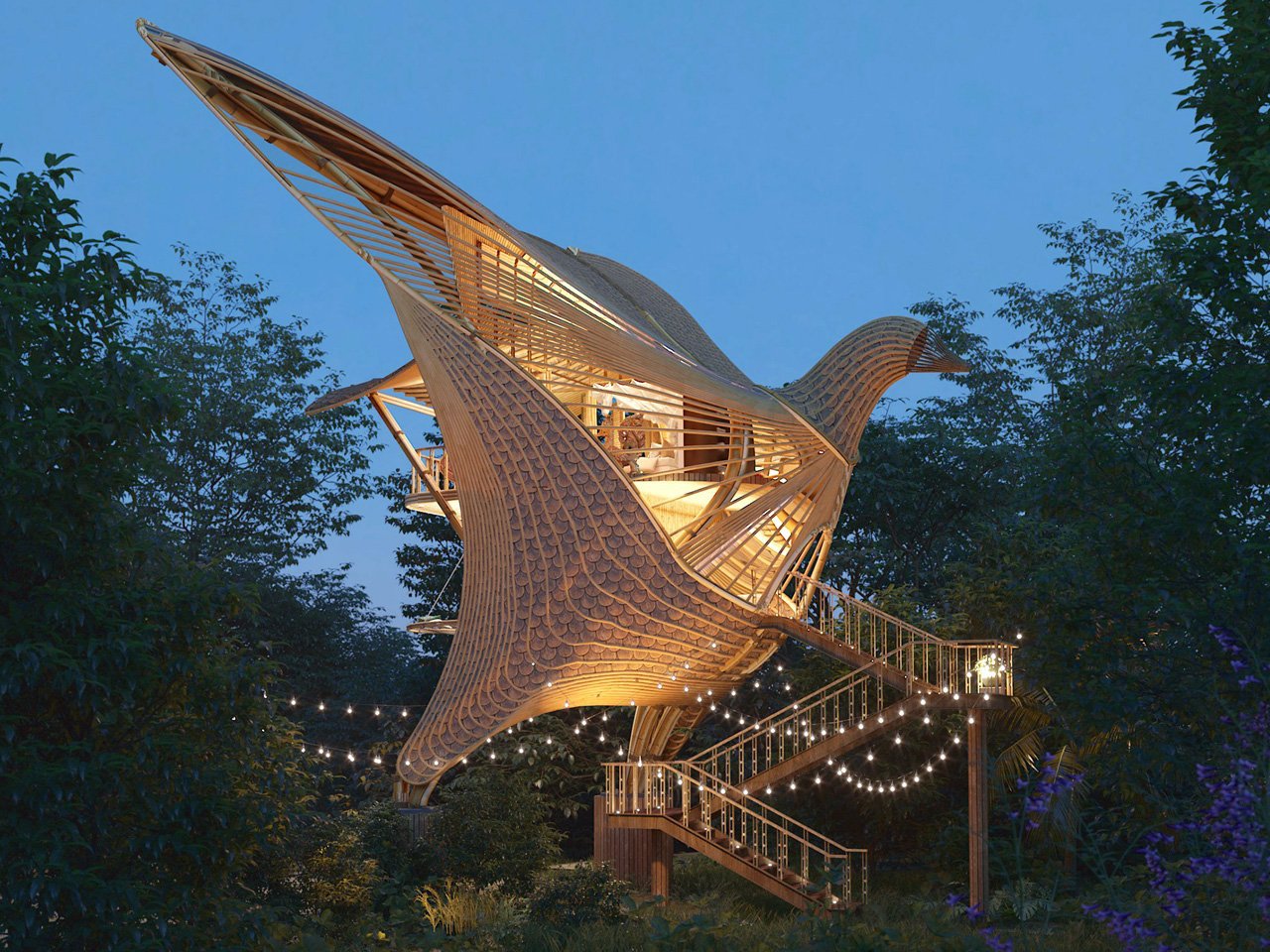 Penca con gracia en el dosel del bosque «Pájaro«La arquitecta de Sri Lanka, Thilina Liyanage, es una villa de bambú y madera de forma brillante como un pájaro alto. Levantado sobre pilotes, su forma alada aparece en el medio del vuelo, se combina naturalmente con sus alrededores. Para las parejas o las familias pequeñas, el birdie tiene olor y comodidad. La villa ofrece un piso de un pájaro, y un piso de un pájaro, y un piso de un piscal Nido. Los materiales cálidos y las curvas de barrido producen retiros esculturales pero acogedores.